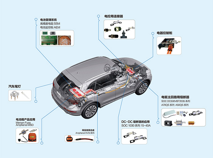 我們可提供用于新能源汽車的直流高壓保險絲、維修開關、高壓連接器和高壓線束總成、電流霍爾傳感器、高精度低溫漂電阻、大功率電阻和傳感器等產品。